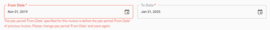 Note: Invoices must be entered in chronological order. If you try to enter an earlier pay period than the previous invoice, you will receive an error letting you know that there is a problem with the pay period.