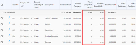 k) To edit the Work Completed % and Materials Stored% uncheck the box and click inside the field to update the value.