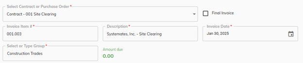 f) Optionally, you can mark this Invoice as the Final Invoice if this invoice has been linked to a Contract or PO. Making a Final Invoice will close out all line items and release all retainage. It will also prevent any further invoices, PCOs, or Change Orders from being created against the Contract or PO.